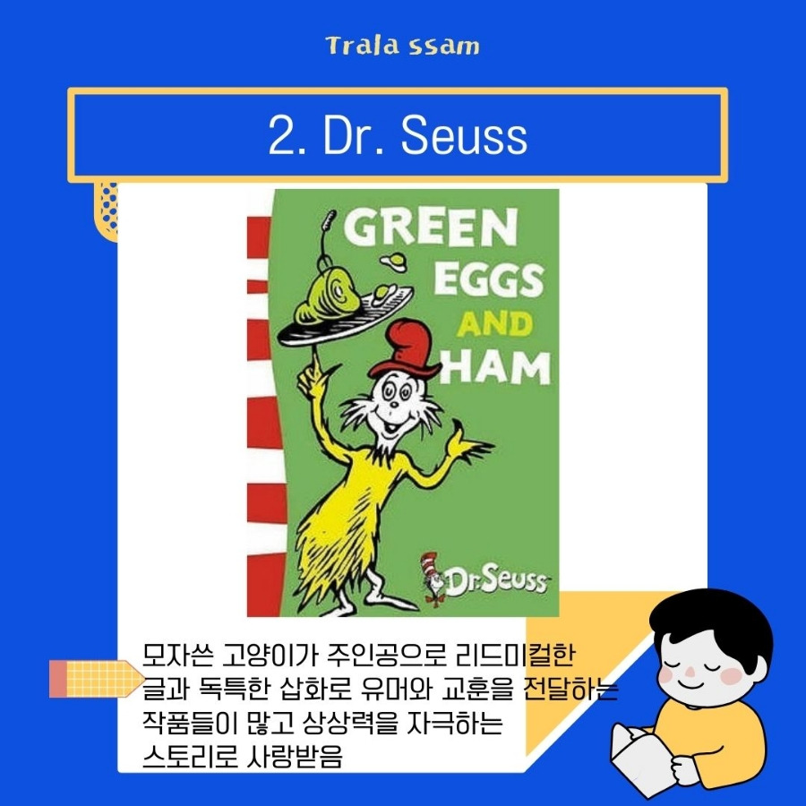 특이한 음식에 도전하는 스토리인 [Green Eggs and Ham] 이외에도 부모님이 없는 동안 집을 방문한 모자 쓴 고양이가 아이들에게 혼란과 재미를 주는 이야기 [The Cat in the Hat] 등이 있다.