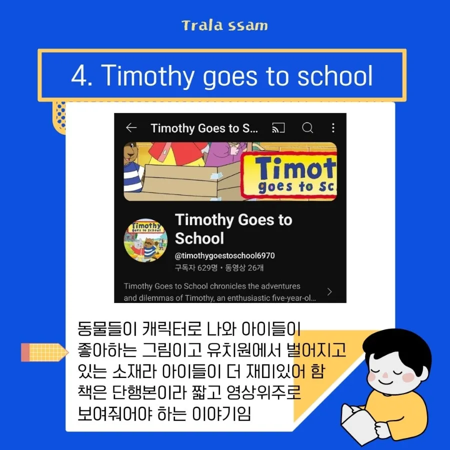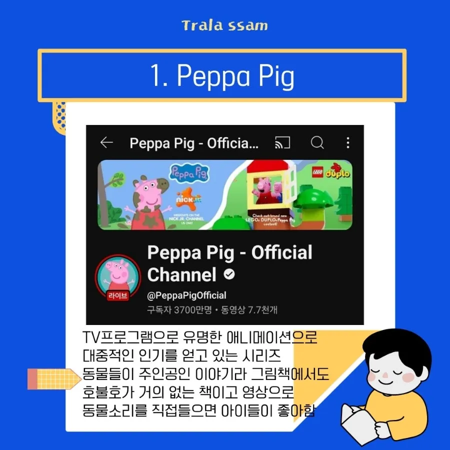 영어영상을 처음 노출시킬 때는 기존의 아이가 좋아하는 그림책 시리즈를 자연스럽게 연결해서 보여주는 것을 추천한다! 그림책 영상은 자극적이지 않아서 좋고 아이들이 아는 캐릭터라서 거부감 없이 빠져든다. 이미지가 쨍한 유튜브 인기동영상부터 노출시키면 아이들이 그림책의 잔잔한 감성에 흥미를 못 느낄 수 있으니 꼭 그림책 연계 영상부터 보여주길 추천한다!