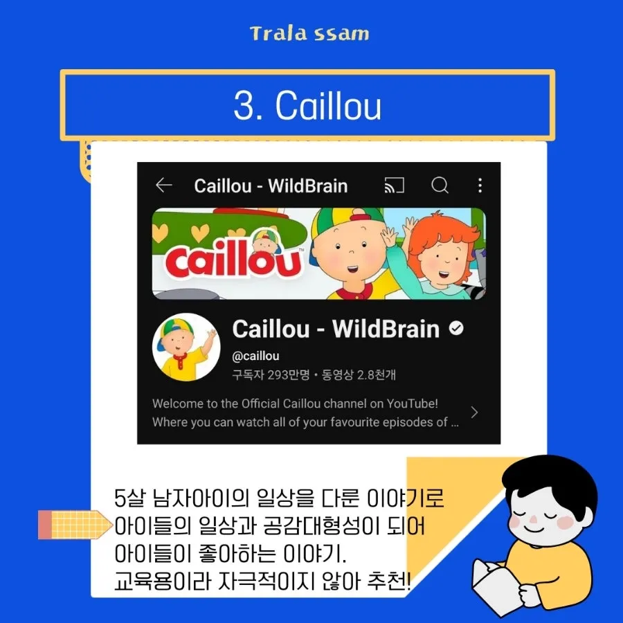5살 소년 까이유!! 이 친구도 사고 좀 치고 다니는 아이인데! 그의 일상생활이 나오니 아이들도 공감대 형성이 되는 듯했다. 영상에서는 할머니가 내레이션을 해주는데 그 목소리가 잔잔하게 듣기가 좋다.