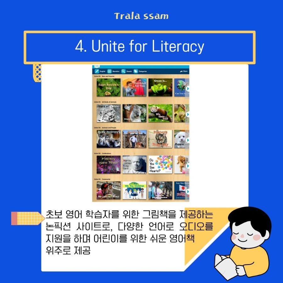 Unite for Literacy는 영어를 처음 접하는 유아 및 초보 학습자에게 적합한 논픽션 사이트이다.