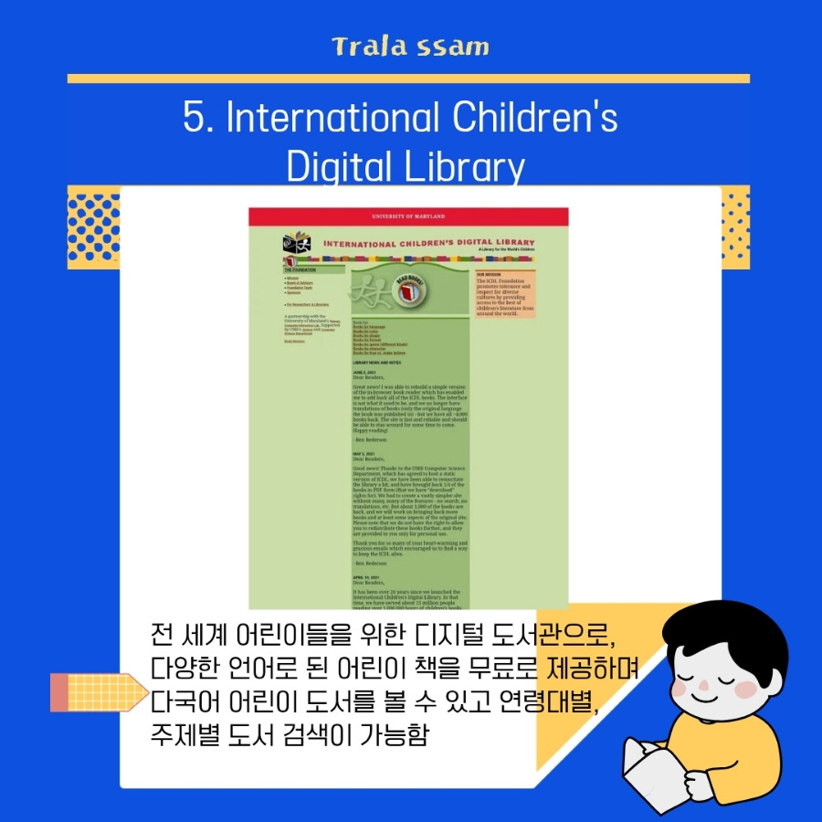 전 세계 어린이들을 위한 무료 디지털 도서관로 다양한 언어와 문화를 반영한 어린이 책을 제공하므로, 다문화 교육에도 추천할 만한 사이트이다.