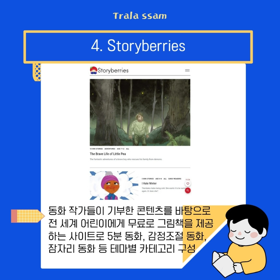 동화 작가들이 기부한 콘텐츠를 바탕으로 전 세계 어린이에게 무료로 그림책을 제공하는 사이트이다.