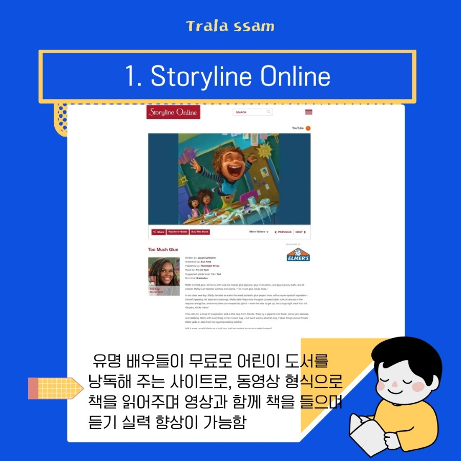 Storyline Online은 아이들이 듣기와 발음 연습을 할 수 있도록 도와주는 사이트로, 생생한 낭독을 통해 영어 리스닝 연습을 원하는 아이들에게 적합하다. 주로 동화책을 읽어주므로 영어 초기 학습자에게 적절한 사이트이다.