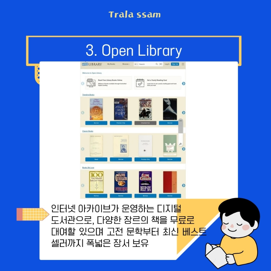 고전 문학, 베스트셀러, 다양한 장르의 영어책을 제공하고 수백만 권의 책을 온라인에서 무료로 대여가 가능하다. 읽기(Preview), 대여(Borrow) 옵션을 통해 원하는 책을 볼 수 있고 최신 도서부터 희귀한 고전까지 다양한 컬렉션을 보유하고 있다.