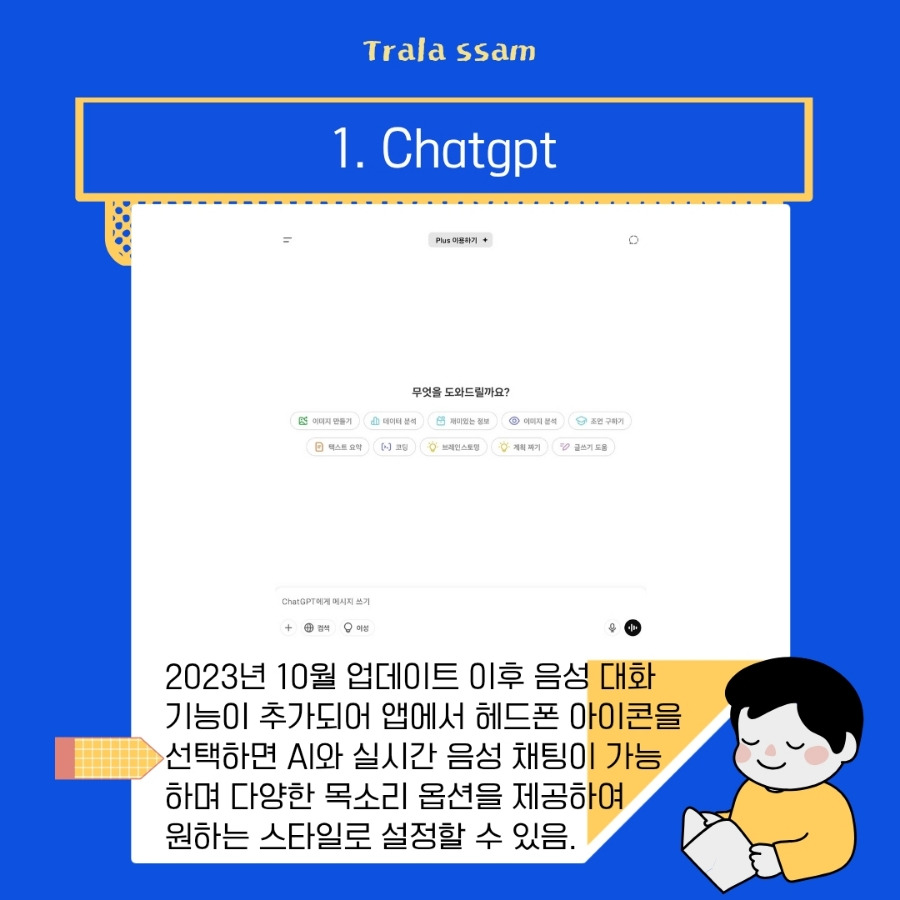 또한 다양한 주제로 질문을 하면 전문적인 수준의 답변을 줄 뿐 아니라 어휘력과 표현력을 높일 수 있고, 발음과 유창성을 향상시키는 데 도움이 된다. 기본 기능은 무료로 제공되고 추가 기능 이용은 ChatGPT Plus 유료 결제가 필요하다.