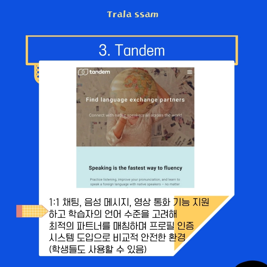 학생들도 상대적으로 안전하게 사용할 수 있도록 인증 시스템을 운영한다는 점이 장점이다. 하지만 언어교환 파트너를 찾는 데 시간이 걸릴 수 있고, 무료 버전에서는 광고가 많으니 주의해야 한다.