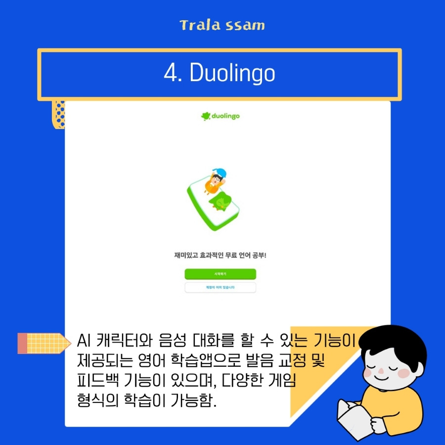 이 포스팅에서 영어 회화 앱으로 몇 번 추천했던 앱으로, 워낙 인기가 많고 많은 사람들이 이미 활용 중이다. AI 캐릭터와 음성 대화를 할 수 있는 기능이 있고, 발음 교정 및 피드백 기능이 있으며 다양한 게임 형식의 학습이 가능하다.