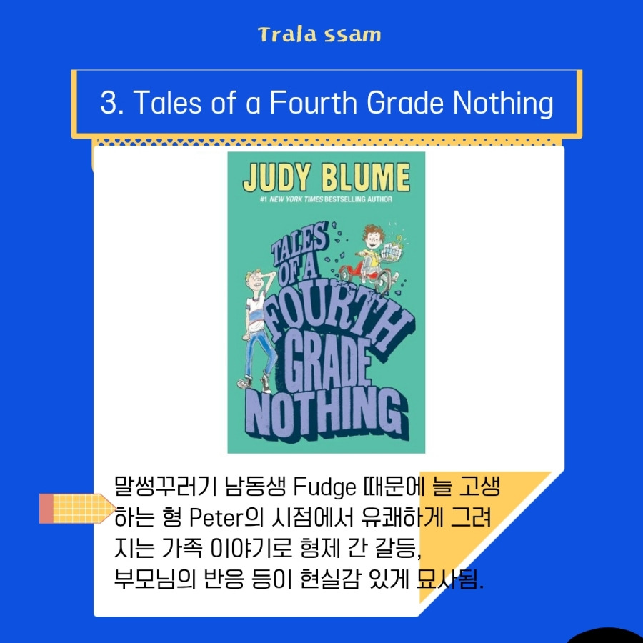 말썽꾸러기 남동생 Fudge 때문에 늘 고생하는 형 Peter의 시점에서 유쾌하게 그려지는 가족 이야기로, 특히 형제간 갈등과 부모님과의 관계 등이 현실감 있게 묘사되었다. 챕터는 총 10장으로 각 장이 서로 연결되어 있지만 독립적인 에피소드처럼 구성되어 있어 한 챕터씩 읽고 이야기 나누기에 좋다. 챕터당 6~10쪽 분량이다.