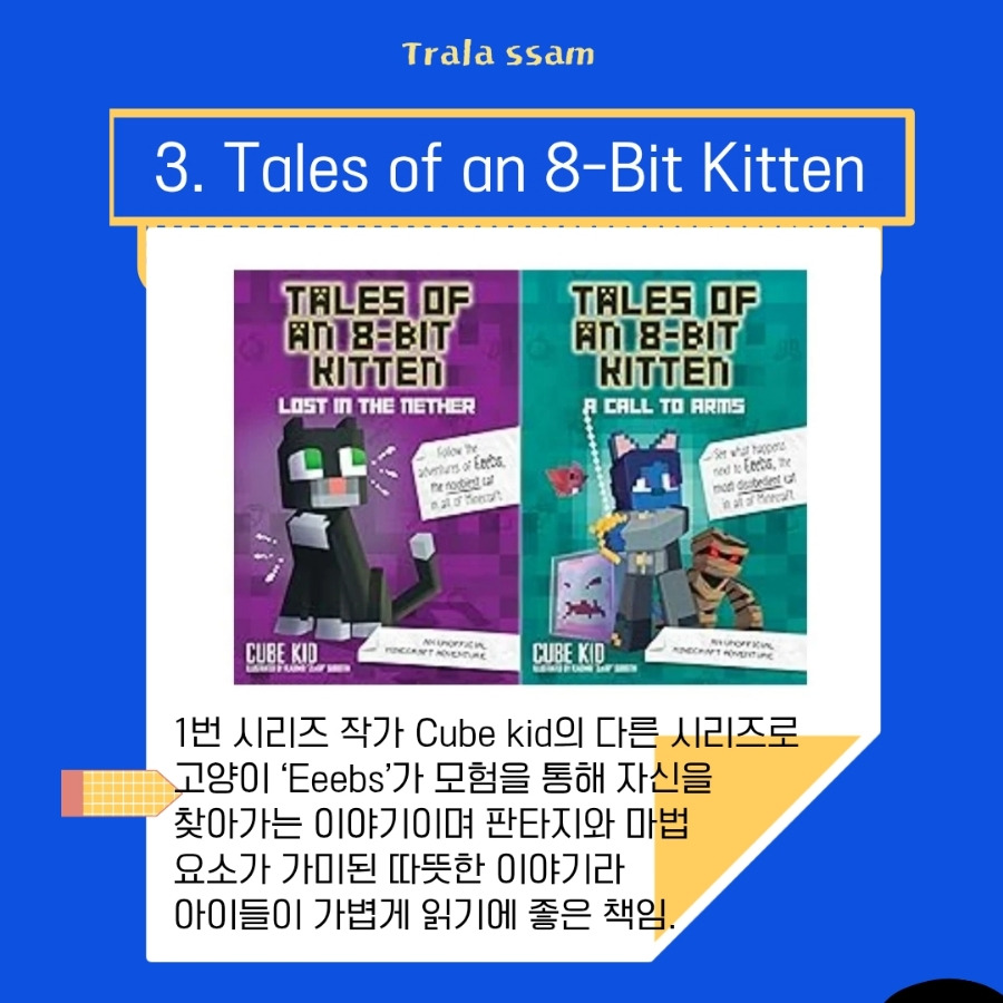 초등 3~5학년(영어 수준 중하)에게 좋은 『Diary of a Minecraft Creeper』는 Cube Kid (1번 『Diary of an 8-Bit Warrior』 작가)의 또 다른 작품으로, 총 2권으로 구성되어 부담이 없는 책이다. 고양이 Eeebs가 모험을 통해 자신을 찾아가는 이야기로, 동물이 주인공이라 여자아이들도 좋아할 만한 책이다.