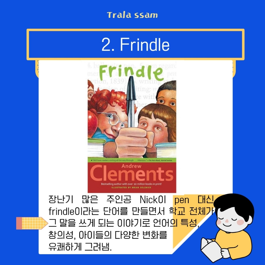 장난기 많은 주인공 Nick이 'pen' 대신 'frindle'이라는 단어를 만들며 학교 전체가 그 말을 쓰게 되는 이야기이다. 챕터는 총 15장으로 이야기 흐름에 따라 시간 순으로 구성되어 있으나, 각 장마다 사건이 명확하게 마무리되어 나누어 읽기 적합하며 챕터당 약 5~8쪽 분량이다.