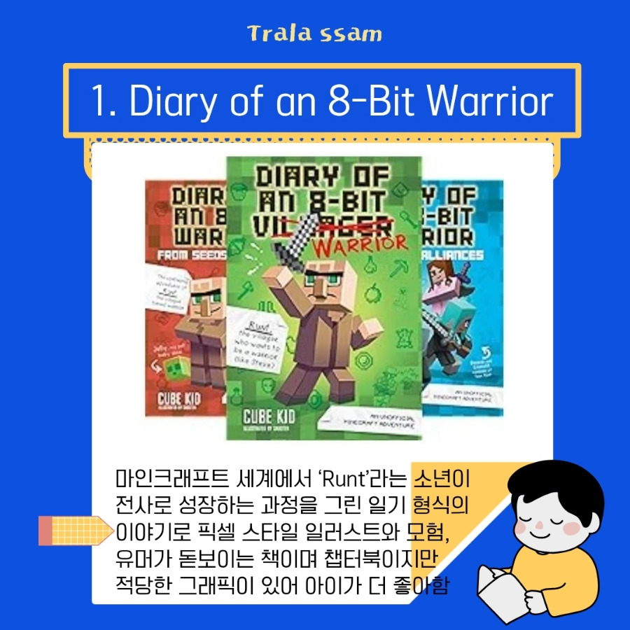 초등 5학년 이상(영어 수준 중상)에게 추천하는 『Diary of an 8-Bit Warrior』는 Cube Kid가 쓴 총 8권의 시리즈이다. 마인크래프트 세계에서 Runt라는 소년이 전사로 성장하는 과정을 그린 일기 형식의 이야기이다. 픽셀 스타일 일러스트와 유머가 가득하여 우리 아이도 요즘 계속 손에서 놓지 않는 책이다. 게임을 좋아하는 아이가 영어로도 몰입할 수 있도록 게임 속의 스토리가 잘 녹아져 있고, 풍부한 어휘와 문장 구조 덕분에 읽을수록 영어 실력도 높일 수 있는 책이다.
