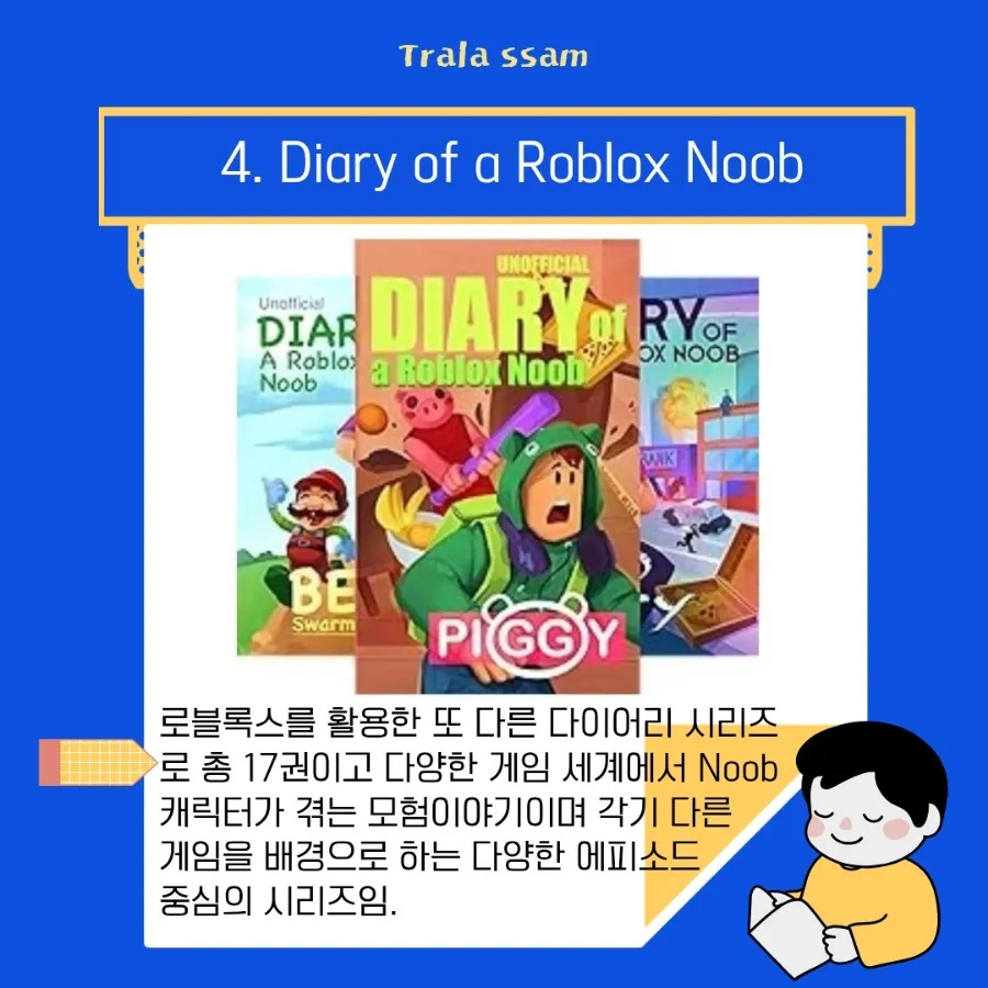 초등 고학년~중학생(영어 수준 중)에게 추천하는 『The Noob Diary』는 Robloxia Kid가 쓴 약 17권 시리즈이다. 로블록스의 다양한 게임 세계에서 Noob 캐릭터가 겪는 모험에 관한 이야기이다.