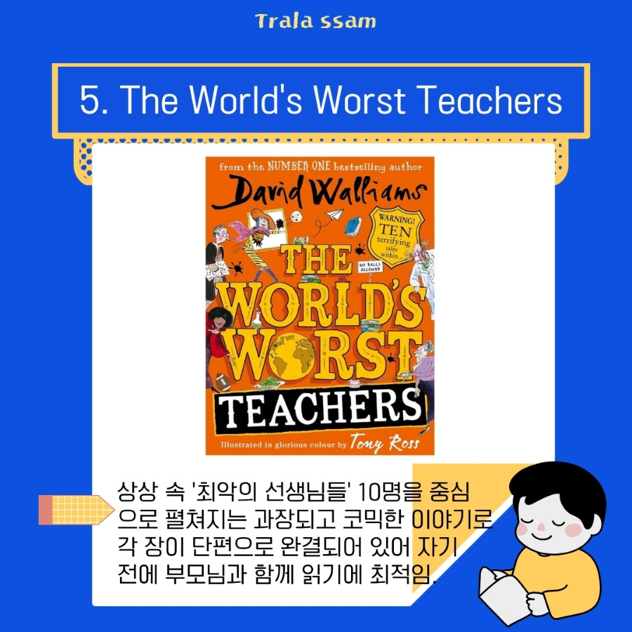 상상 속의 최악의 선생님들 10명을 중심으로 펼쳐지는 코믹한 이야기들로, 각 장이 단편으로 완결되어 있어 자기 전에 부모님과 함께 읽기 좋은 책이다. 각 선생님이 한 챕터의 주인공으로 등장하며 완전히 독립된 단편 이야기 구조이다.