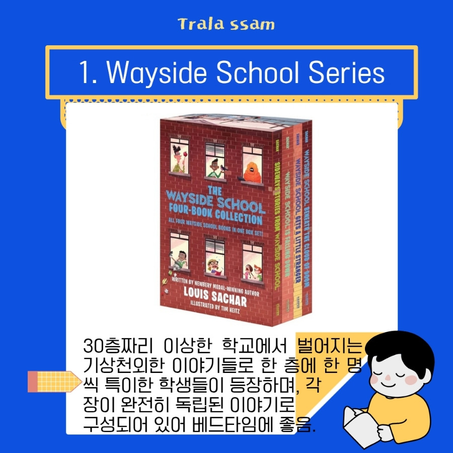 이 다섯 권 모두 그래픽 노블이 아니면서도 유쾌한 분위기와 단편 챕터 덕분에 아이와 함께 나누는 베드타임용으로 추천한다. 매일 밤 아이와 웃으며 영어로 이야기를 나눠보면 좋을 것이다. 만약 자기 전 책 읽기가 여의치 않다면 주말에라도 한 챕터씩 함께 읽고 하하 호호 유대감을 나누었으면 한다. 아이들은 부모와의 이런 따뜻한 순간을 기억하기 때문에, 그 분위기와 맞물려 영어를 긍정적으로 인식하게 되어 두 마리 토끼를 잡을 수 있을 것이다.