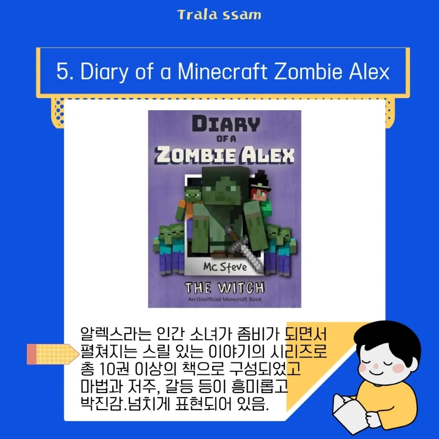 초등 고학년~중학생(영어 수준 중)에게 추천하는 『Diary of a Minecraft Zombie Alex』는 M.C. Steve이 쓴 10권 이상의 시리즈로, 알렉스라는 인간 소녀가 좀비가 되면서 펼쳐지는 스릴 있는 이야기이다.