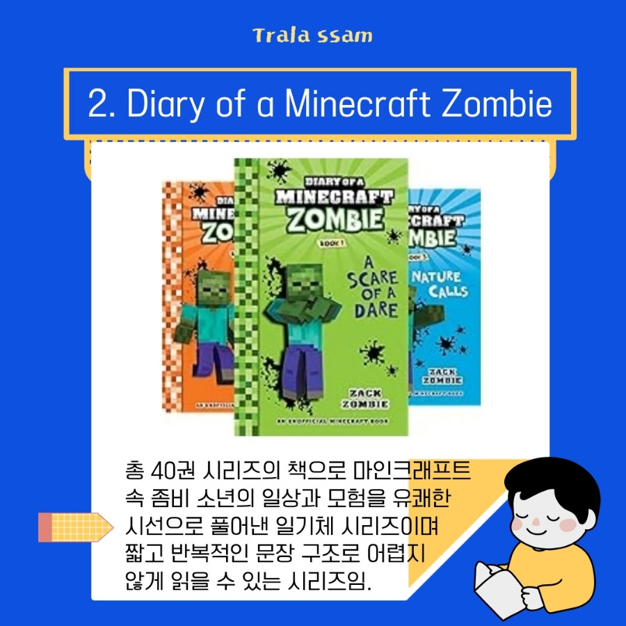 초등 3~5학년(영어 수준 중하)에게 추천하는 『Diary of a Wimpy Zombie』는 Zack Zombie가 쓴 40권 시리즈이다. 마인크래프트 속 좀비 소년의 일상과 모험을 유쾌한 시선으로 풀어낸 일기 형식의 이야기로 구성되어 있다. 그래서 아이들이 읽기에 짧고 반복적인 문장 구조로 부담이 적은 편이다.