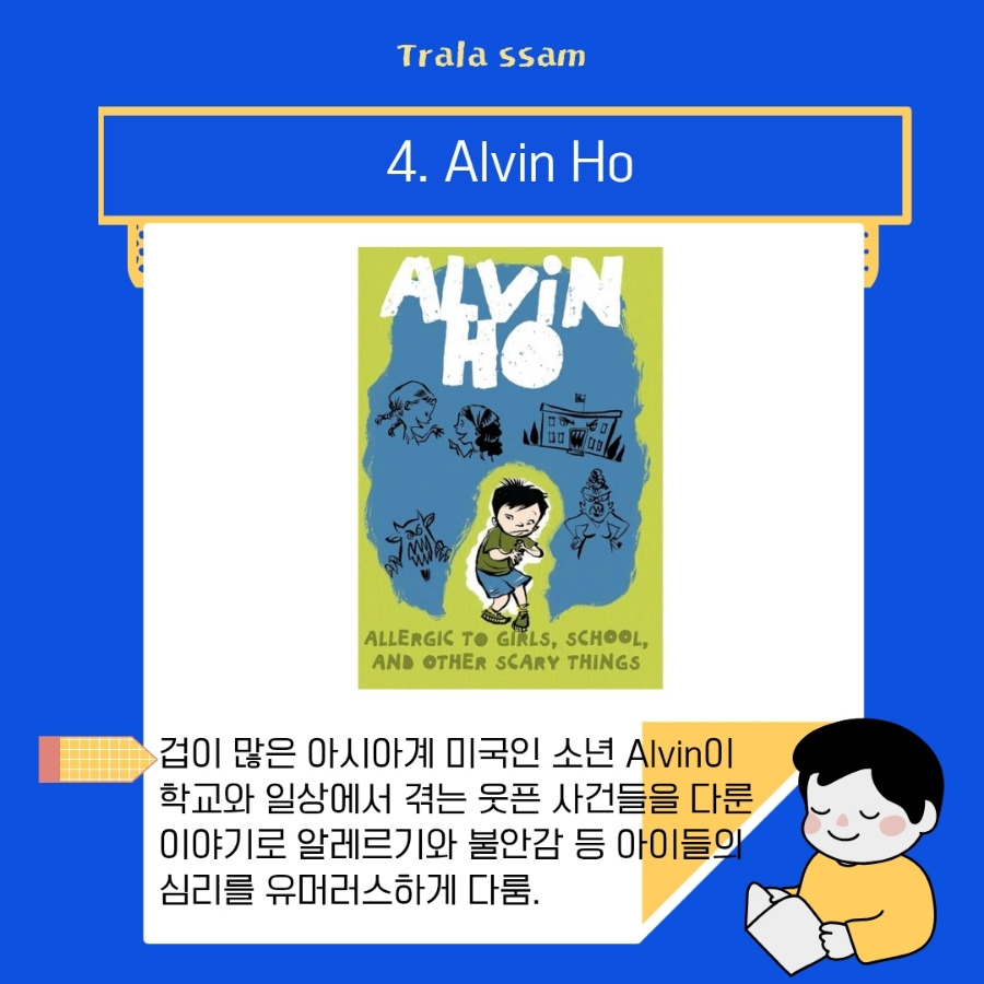 겁이 많은 아시아계 미국인 소년 Alvin이 학교와 일상에서 겪는 웃픈 사건들을 다룬다. 알레르기와 불안감 등 아이들의 심리를 유머러스하게 표현하였다. 챕터는 총 14장이고 각 장은 Alvin이 겪는 하나의 사건을 중심으로 하며 일기 형식처럼 감정과 생각이 솔직하게 표현되어 있다. 챕터당 5~7쪽 정도 분량이다.