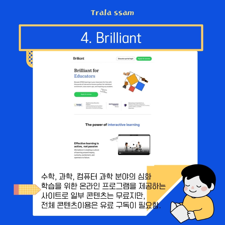 Brilliant는 수학, 과학, 컴퓨터 과학 분야의 심화 학습을 위한 온라인 프로그램을 제공하는 사이트로, 학습 자료의 완성도와 퀄리티가 좋은 사이트이다. 웹사이트에 가입하여 원하는 과정을 선택하고 학습을 시작할 수 있으며, 역시 교사 인증을 하면 무료로 학생들에게 학습 자료를 제공할 수 있다. 일부 콘텐츠는 무료로 제공되지만, 전체 콘텐츠를 이용하려면 유료 구독이 필요한 사이트이다.