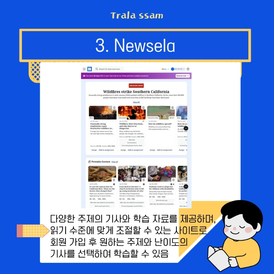 Newsela는 다양한 주제의 기사와 학습 자료를 제공하는 영어 콘텐츠 사이트로, 자신의 읽기 수준에 맞게 조절이 가능하다. 회원 가입 후 원하는 주제와 난이도의 기사를 선택하여 학습할 수 있고, 콘텐츠의 종류가 다양하여 많은 종류의 영어 자료를 검색할 수 있다.