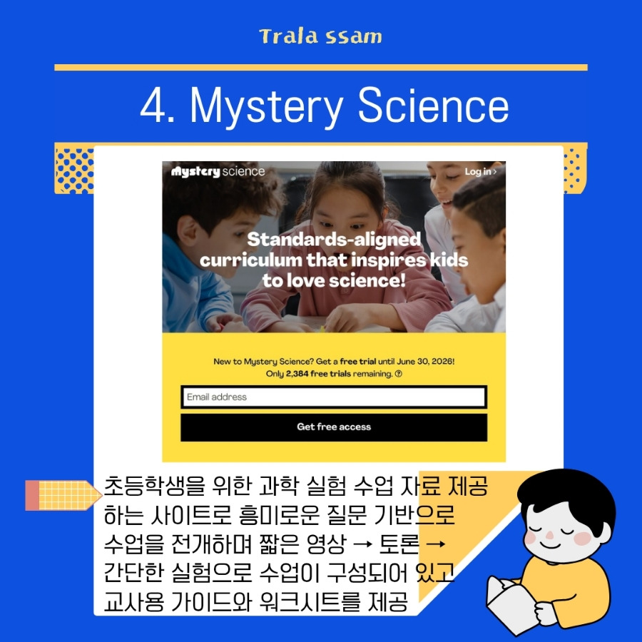 '왜?'에서 출발하는 초등 과학 호기심 수업을 제공하는 Mystery Science는 짧고 흥미로운 질문으로 시작하는 스토리텔링식 과학 수업으로, 영상, 토론, 실험 활동으로 구성된 사이트이다. 별도 교구 없이 집에서 실험 가능한 활동이 많아 더욱 유용하다.