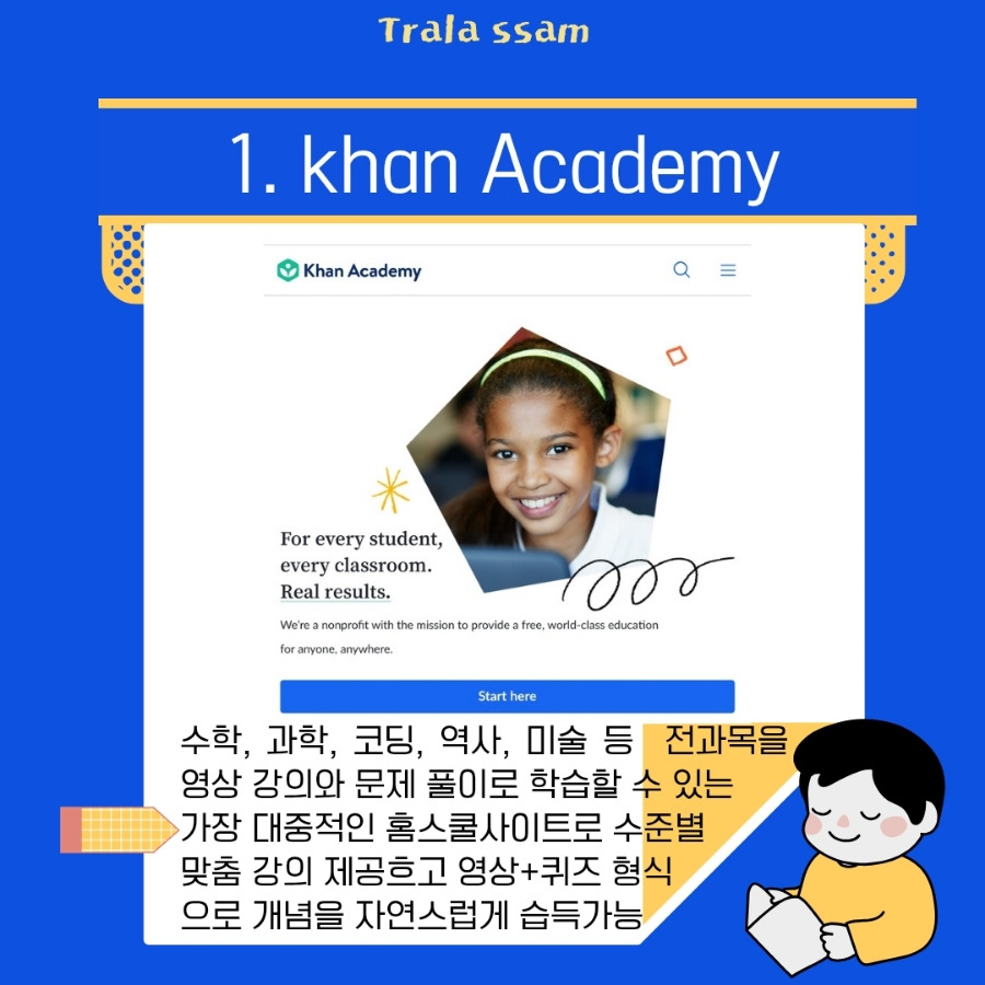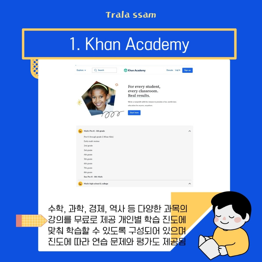 특히 오늘 소개하는 사이트 중 중복해서 소개하게 되는 사이트가 있는데 바로 칸 아카데미이다. 처음 칸 아카데미가 세상에 나왔을 때 학교는 없어질 것이라고 예측하는 사람들이 많았다.(물론 펜데믹을 겪은 우리는 학교는 절대 없어지지 않을 것이라고 느꼈지만..) 그 정도로 교육과정을 기반으로 한 체계적이고 훌륭한 퀄리티의 온라인 학습 사이트였다. 그 이후에도 다양한 홈스쿨링이 가능한 사이트들이 등장했고 이제는 이러한 양질의 학습자료를 잘 활용하지 못하면 시대에 뒤떨어지는 사람이라고 평가받는다.