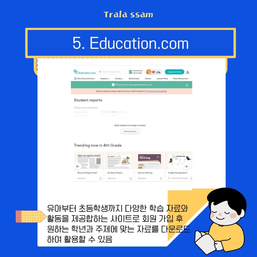 Education.com은 어린 유아부터 초등학생까지 다양한 학습 자료와 활동을 제공하는 사이트로, 그래픽에 집중하여 만든 콘텐츠가 많다. 영어, 수학, 과학, 사회 등 다양한 과목의 콘텐츠가 있고, 수업 지도안부터 학습지, 학습용 게임까지 교사, 학부모, 학생 모두에게 유용한 사이트이다.