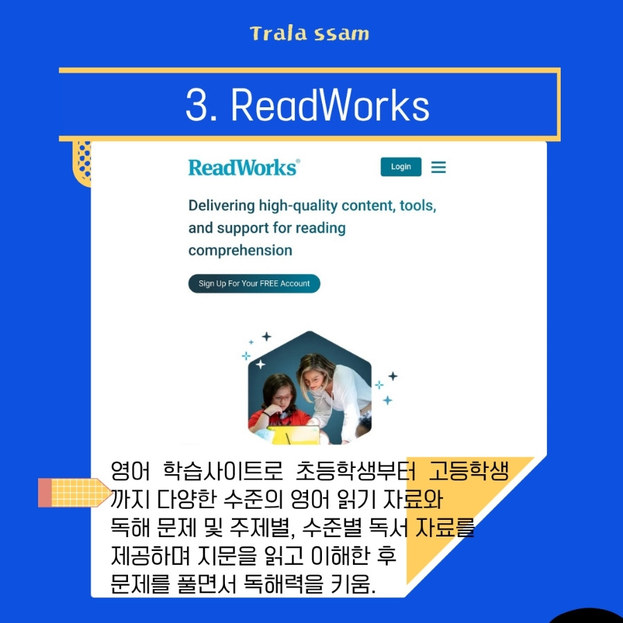 영어 독해 실력 향상을 위한 비문학 중심 플랫폼인 ReadWorks는 다양한 주제의 지문, 듣기 기능, 질문지로 구성된 영어 학습 사이트로, 영어 홈스쿨링에 유용하다. 미국 교사들이 실제 수업에 사용하는 자료를 기반으로 하며, 과학, 역사, 문학 지문 등 융합형 독해 학습이 가능하다.