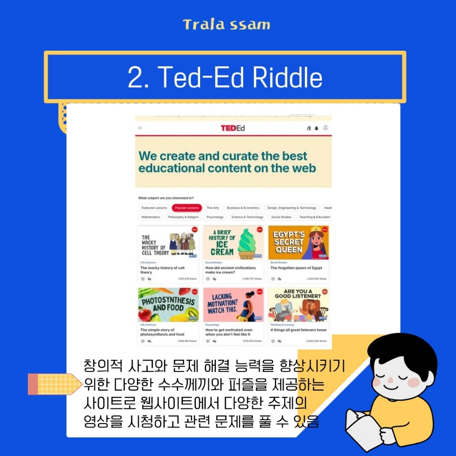 TED-Ed와 연계된 사이트라서 수수께끼와 퍼즐 이외에도 다양한 학습 자료를 이용할 수 있고, 전 콘텐츠 무료로 이용이 가능하다. 자신이 정한 학습 주제의 학습이 끝난 후 이 사이트의 수수께끼 및 퍼즐을 복습으로 활용해도 좋다.