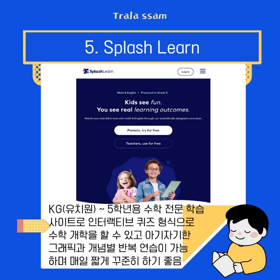 게임처럼 즐기는 초등 수학 퀴즈를 제공하는 SplashLearn은 학년별 수학 커리큘럼에 따라 게임 기반 퀴즈를 제공하는 사이트이다. 반복 연습을 통해 개념 정착 및 빠른 피드백이 가능하고, 모바일 앱으로 언제 어디서나 학습이 가능하다.