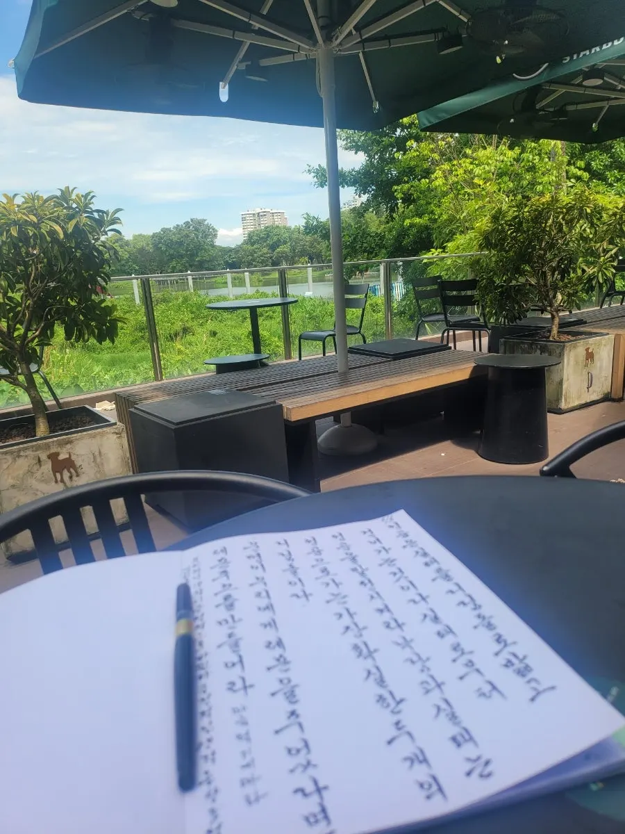 안에서 땀을 식히고는 슬슬 추워진 몸을 데우려 아무도 없는 야외석에서 혼자 고즈넉하게 요즘 꽂힌 고전필사를 하니 마음의 평안이 온다.