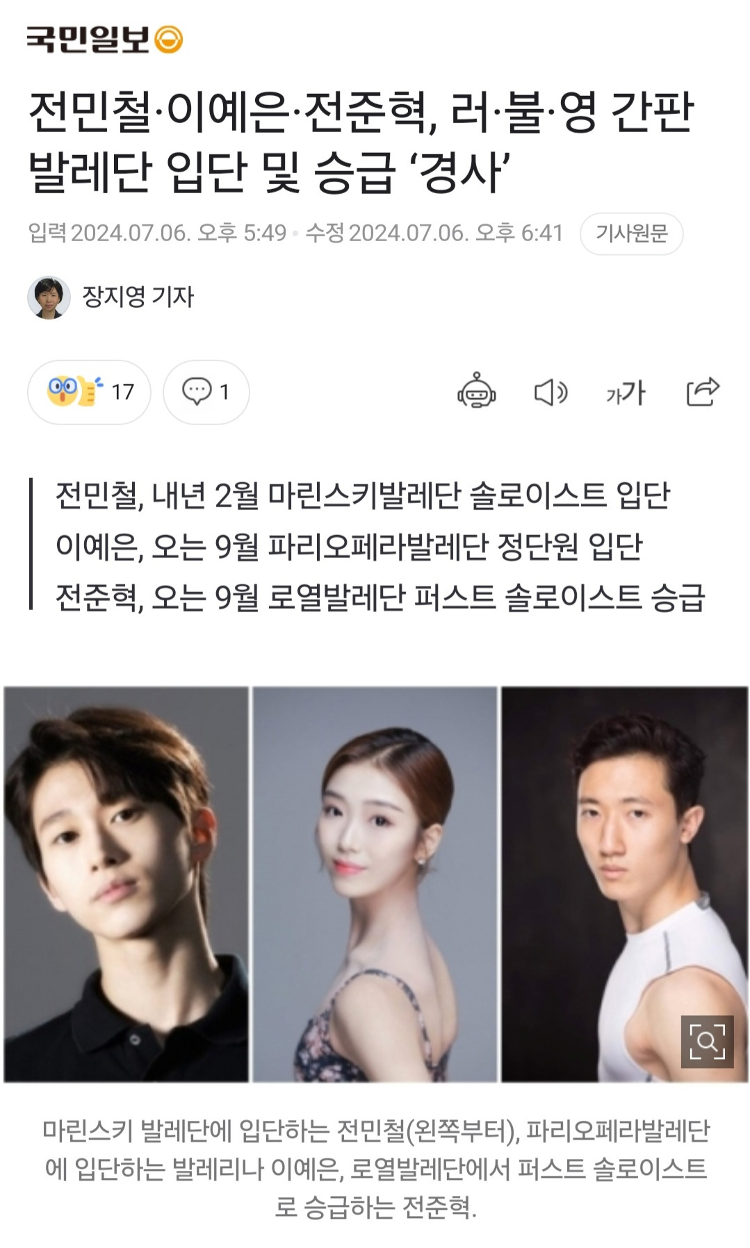 발레의 역사가 짧은 한국이 세계로 뻗어나가고 있습니다. 모두 모두 축하해주셔요. 세 분 모두 꽃길만 걸으시고, 세계발레사에 길이 남을 발레 무용수들이 되기를 기원합니다.