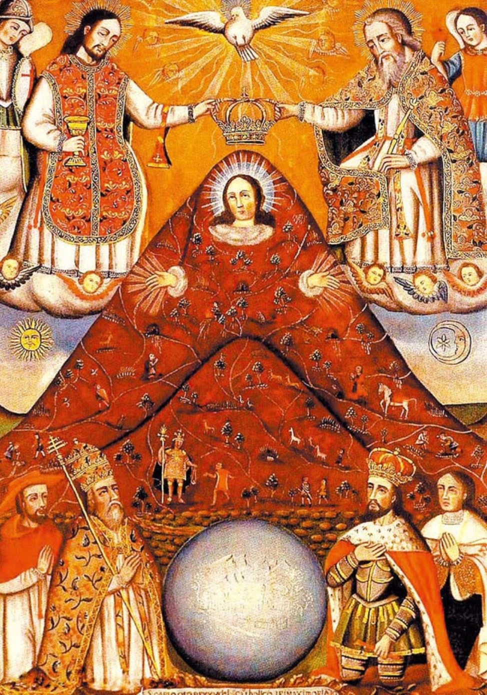 그림의 아래 왼편에는 교황이 기도를 올리는 모습이 묘사돼 있다. 오른편에는 스페인의 국왕이자 신성로마제국의 황제였던 카를 5세가 가슴에 손을 얹고 있다. 이들 위로 보이는 황금색 복장의 작은 인물은 잉카제국의 황제로, 유럽인이 옮겨온 천연두에 걸려 사망한 우아이나 카팍(Huayna Capac)이다. 왜소하게 표현된 카팍 뒤로 붉은 산이 성모를 덮고 있는데, 역사가들은 이를 안데스 산맥의 토지의 여신인 파차마마(Pachamama)를 성모상과 결합시킨 것이라고 해석한다. 산의 양옆으로 떠 있는 해와 달도 잉카제국에서 사용되던 형상이다. 유럽의 기독교와 잉카의 전통신앙을 혼합한 형태의 작품이다.