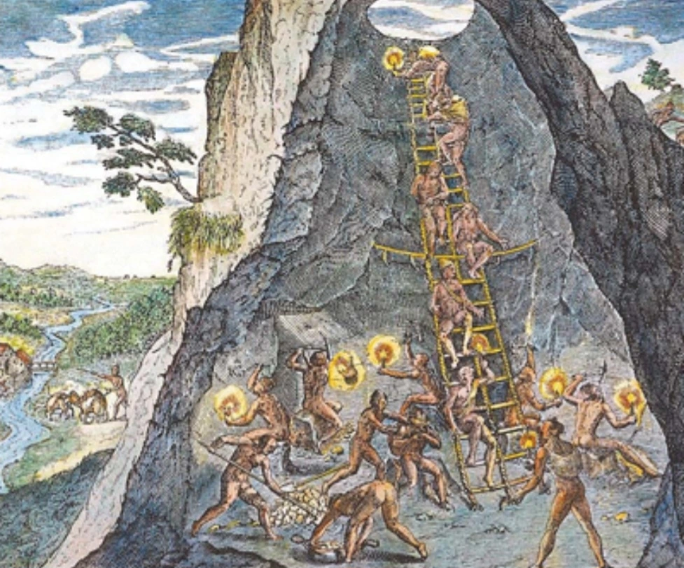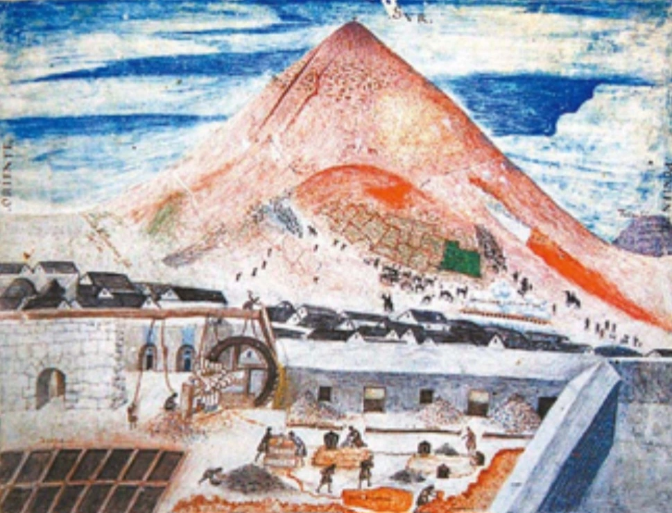그림은 볼리비아의 세로 리코에 있는 은 광맥으로 '포토시'라고 불리우는 곳이다. 스페인 정복자들이 아메리카 대륙에서 원주민들의 금, 은을 탈취하다가 초대형 은 광맥을 발견하고는 원주민들을 동원해 노동력을 착취하면서 엄청난 양의 은을 채굴, 제련, 확보했다.