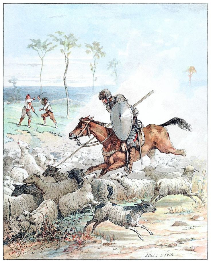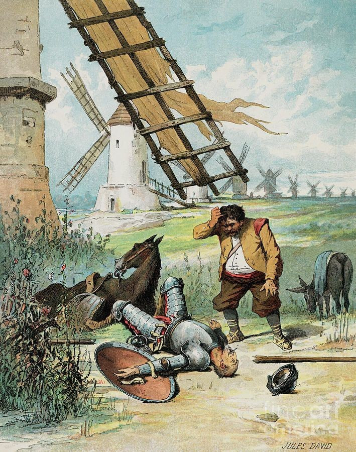 세르반테스가 당대에 유행하고 있던 기사도 문학을 풍자하기 위한 기사도 문학, 당시의 종교 갈등, 지배 계층을 풍자, 새로운 지배계층의 등장과 함께 무기의 변화, 해상무역과 식민지 개척을 통한 항해 기술 발달, 돈키호테와 산초 유형의 캐릭터 자체를 풍자, 두 캐릭터를 통해서 작가 자신의 인생에 대한 통찰력 등을 담아낸 많은 것을 엿볼 수 있는 소설 <돈키호테>. 세르반테스의 소설에서 돈키호테는 아는 것을 실천하기 위해 모험을 떠났지만 오직 지식을 나열할 줄만 알고 정작 산초가 위험에 처했을 때에는 비겁한 모습을 보이기까지 한다. 또 산초는 매우 현실적이고 똑부러지는데도 묘하게 분별력이 떨어진다.