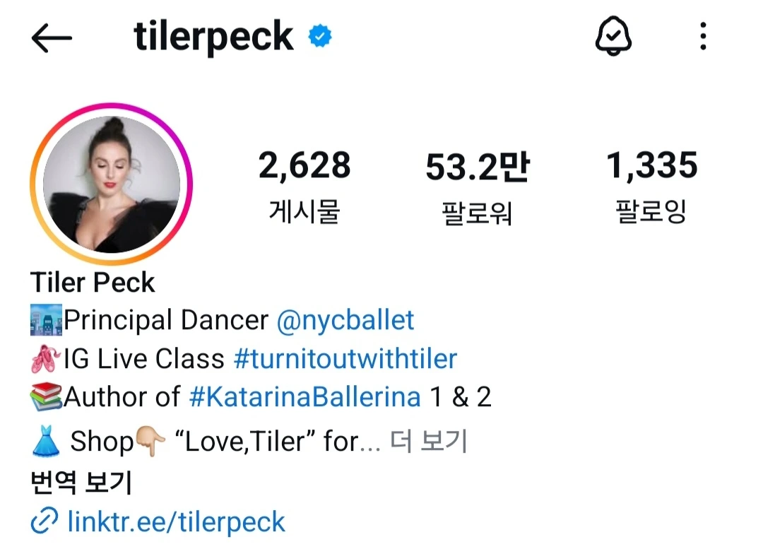 정말 미국적인 발레리나이다. 아이돌 댄스도 기가 막히게 잘 춘다. 심지어 대리석 조각처럼 생긴 이탈리아 발레리노 로베르토 볼레도 타일러 펙과 함께 아이돌 댄스를 췄다. 골목 대장 기질이 있는지 주변 사람들이 뭐에 홀린듯이 타일러 펙이 시키는대로 아이돌 댄스를 추는 듯 하다. 인스타를 보고 있으면 웃음이 빵 터지는 게시물들이 많다.