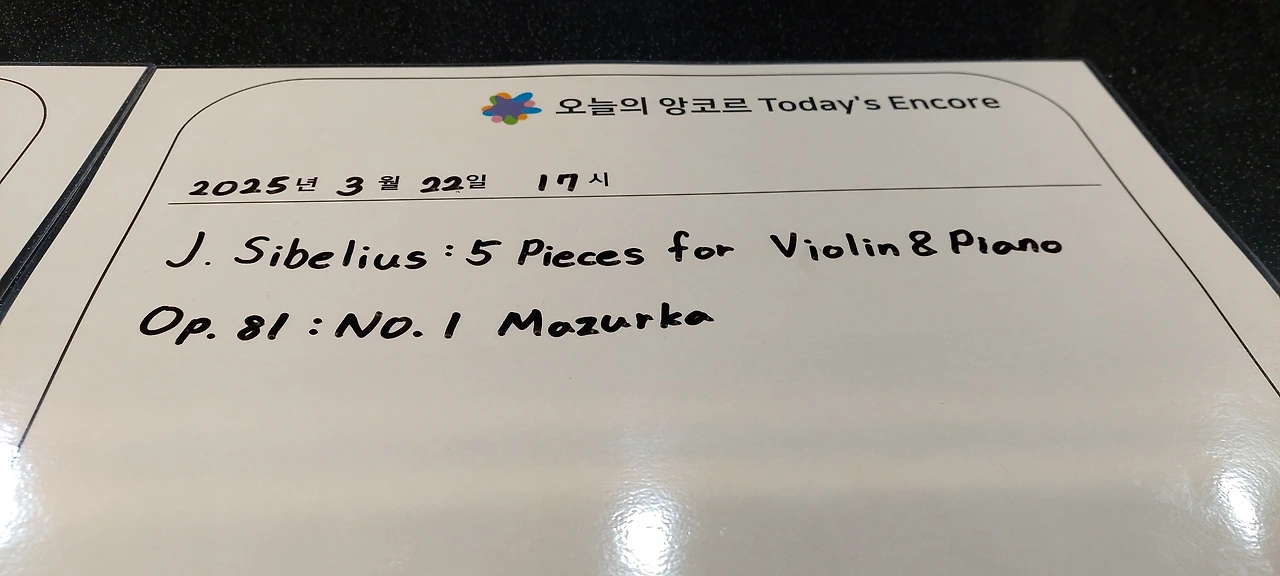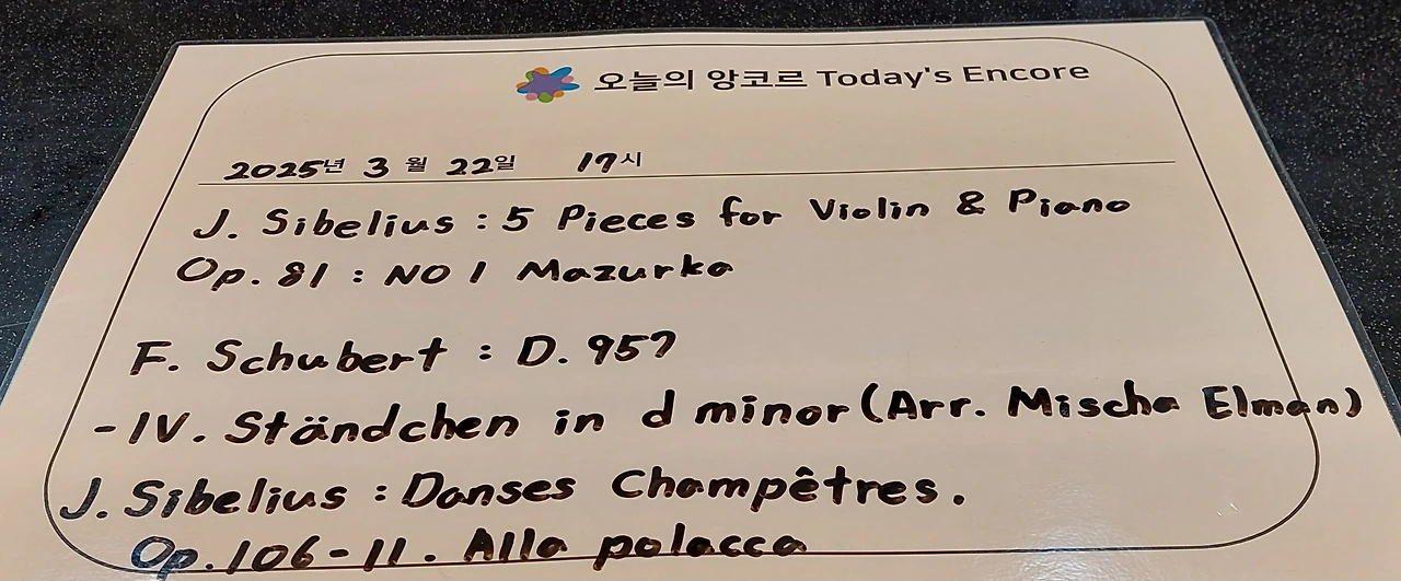 앙코르때 어떤 분이 "사랑해요!"하고 외쳤더니 양인모 연주자님이 씩 웃으셨다. 실황에서는 이런 재미난 에피소드를 보게 되는구나.