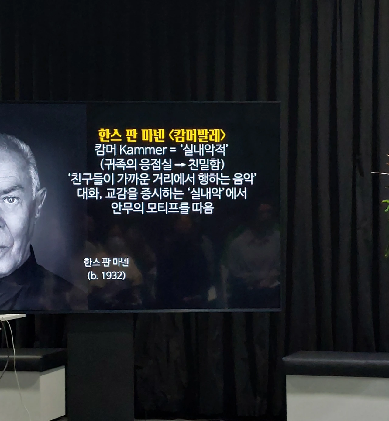 2주전 19일 일요일에는 서울시 발레단과 풍월당이 협업한 발레음악 강의가 서울시 발레단 연습실에서 있었다. 그 날 풍월당의 나성인 선생님이 발레의 역사를 인문학적인 시각으로 접근하면서 어제부터 시작된 서울시 발레단의 더블빌 <한스 판 마넨×허용순>에 나오는 도메니코 스카를라티, 카라 카라예프, 존 케이지, 에지오 보쏘의 음악들에 대한 강의까지 이어졌다.