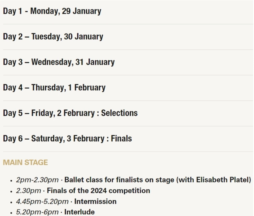 몇 분에 해당하는 작품을 무대 위에서 추는 것으로 심사위원들이 평가를 하는 다른 콩쿠르와는 달리 스위스 로잔 발레 국제 콩쿠르는 6일 동안 진행하면서 학생들이 발레 클래스를 임하는 것부터가 점수에 들어가는 것이 특징이다.