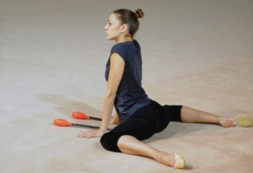 그런 다음 사이드 스플릿 상태에서 상체를 앞으로 숙인다. 최소 25초 이상 이 자세를 유지한 다음 고관절을 돌려서 개구리 자세로 넘어간다.