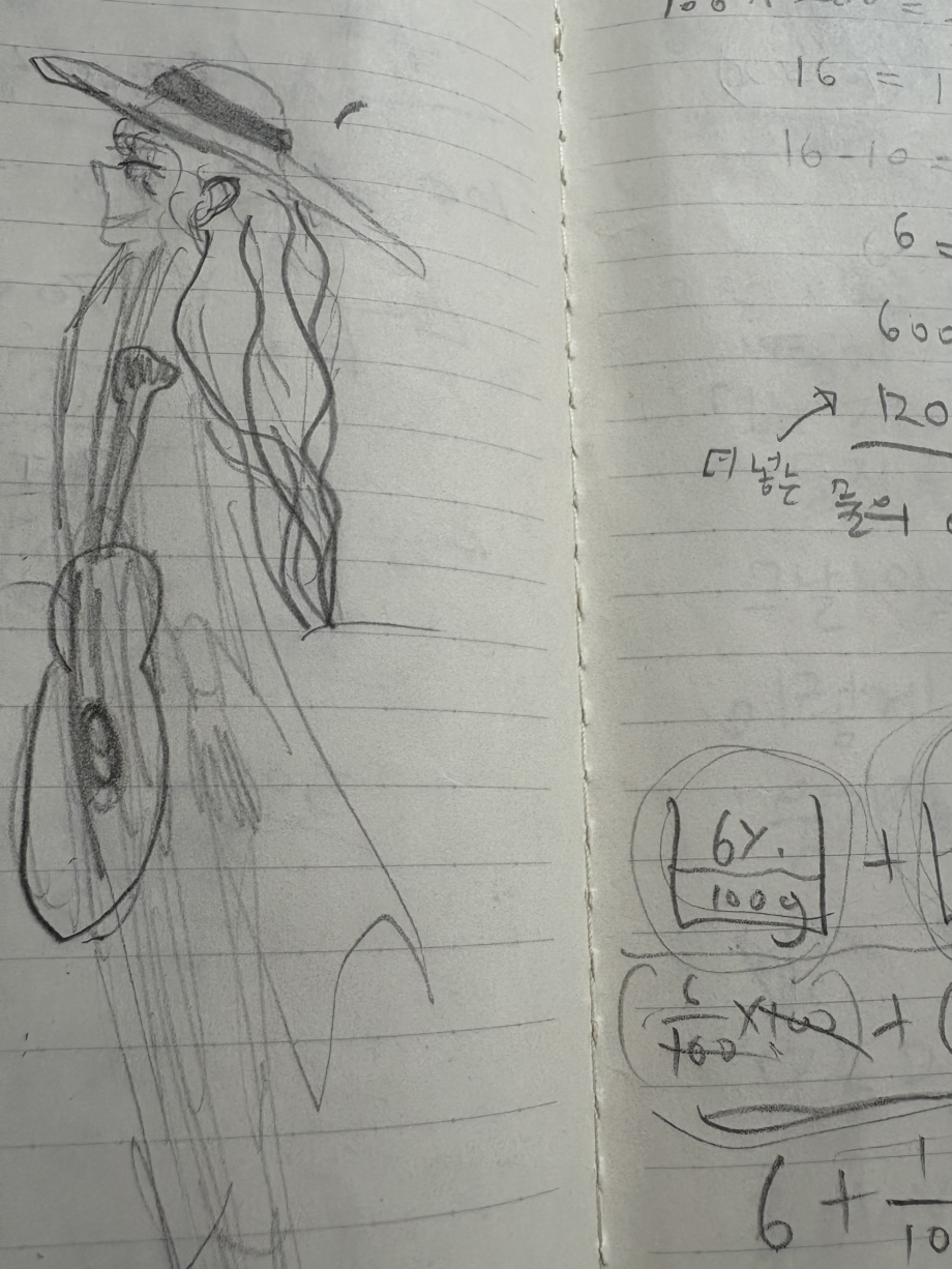 마음을 차분히 가다듬었다. 후... 이런 상황에 나에게 "괜찮아, 너만 그런 거 아냐. 훌훌 털어내 버려! 내 노래 들으면 글이 술술 써질지 누가 알아? 들어볼래?" 위로하며 딩가딩가 기타 치며 부드럽게 노래 부르는 유쾌하고 따스한 소년이 떠올랐다. 그의 노래 속에서 영감을 얻게 해 주는.. 지금의 나에게 너무나도 필요한 존재였다. 그런 소년이 친구로 있다면 좋겠다 싶었다. 마침 글을 끄적이던 노트장 빈구석에 머릿속에 있던 모습을 쓱쓱 대충 그려보았다.