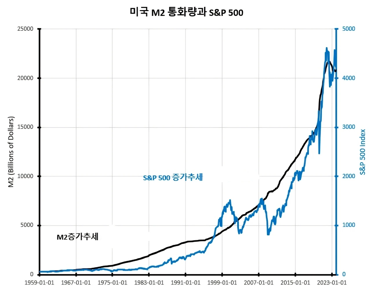위 그래프와 같이 미국 통화량 증가와 s&p500 지수의 증가는 상당히 높은 상관관관계를 보여줍니다.