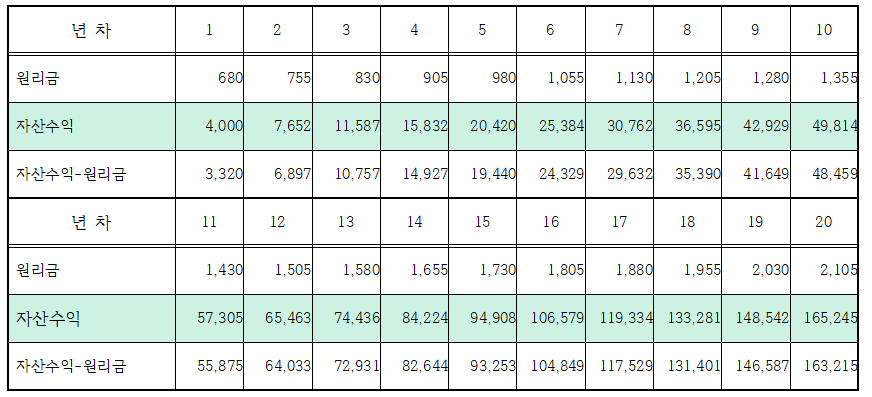 자산수익으로 대출원리금을 다 갚고도 큰 수익이 남으며, 20년이 지나면 16억 정도의 이익의 생긴다. 가람이네 A아파트와 마찬가지로, 현수의 아파트 값도 10억이 되었다.