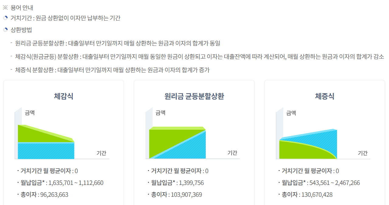 그러다 주택도시기금의 디딤돌대출 상품을 알게 되었다. 디딤돌대출 30년, 1.6%금리(신혼가구, 자녀 등 우대금리 적용)로 아파트가의 80%인 4억을 빌리고 나머지 1억은 본인의 자산으로 부담하기로 한다. 그리고 디딤돌대출은 체증식 상환이라는게 가능하다는 걸 알아서 체증식 상환으로 진행한다. 체증식 상환이란 첫해에는 원금을 조금만 갚고, 나중으로 갈수록 점점 많이 갚아 나가는 구조이다. 1년차에는 연간 680만원, 2년차에는 연간 755만원 3년차는 연간 830만원.. 이런식으로 증가한다.