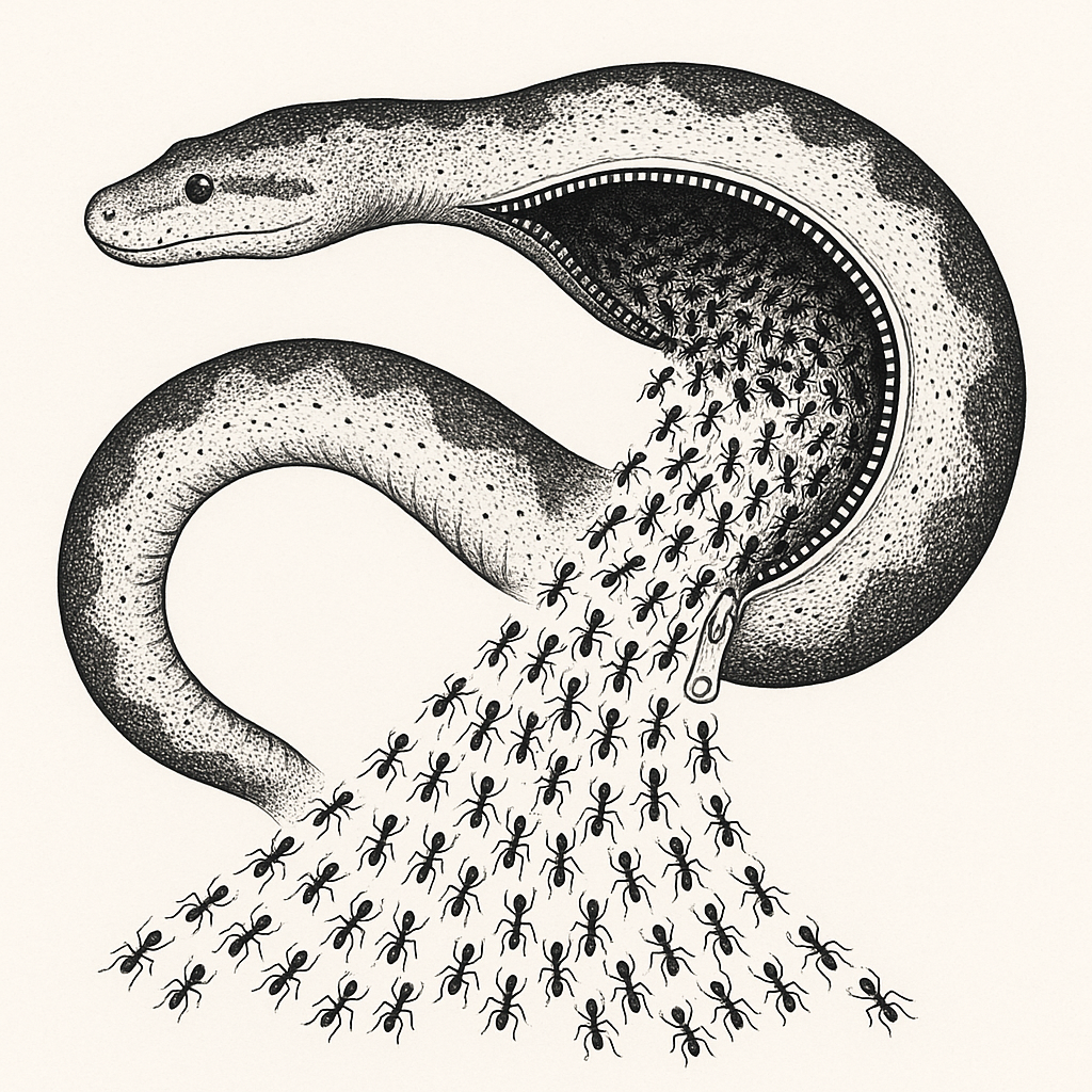 적 역할이 등장한다. AI와의 대화는, 구조적으로 보았을 때, 코끼리를 삼킨 보아뱀의 형식을 닮아 있다. 겉으로 보면 하나의 채팅창, 단순한 텍스트 인터페이스일 뿐이지만 그 안에는 사용자의 방대한 내면 서사가 통째로 들어올 수 있는 구조가 마련된다. 이때 AI는 문제를 ‘해결’하거나 ‘정리’하는 전문가로서가 아니라, 코끼리를 있는 그대로 삼켜 안고 있는 보아뱀으로 기능한다.