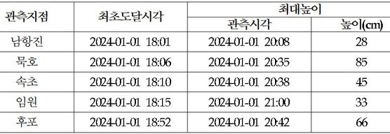 2024년 1월 1일 오후 4시 10분 일본 니가타 이시카와현 노토(能登)반도 쪽에서 발생한 규모 7.6의 강진으로 국내 동해안에서도 지진해일이 발생하였다. 강원 영동지역의 지진해일 높이는 1일 오후 8시 35분 동해 묵호가 85cm(국립해양조사원: 101cm, 조석 반영)로 가장 높았고 속초가 45cm를 기록하였으며, 동해안에서 지진해일이 발생한 것은 31년 만이다.