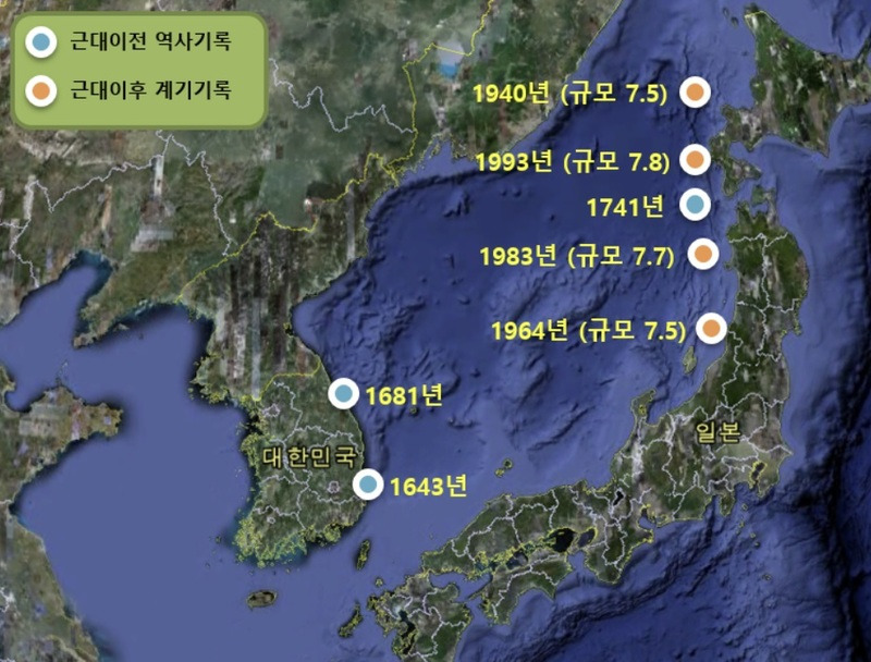 1993년 7월 12일 22시 17분 일본 홋카이도 오쿠시리섬 북서쪽 근해에서 발생한 규모 7.8의 강진으로 묵호 276cm, 울릉도 119cm, 속초 203cm, 포항 92cm의 최대파고를 기록하였다.