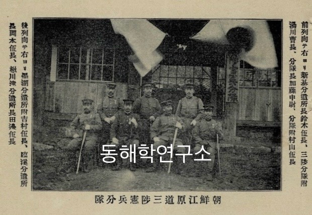 그러나 《강원도상황경개(江原道狀況梗槪, 1913)》에 따르면 이즈음에 조선 강원도 삼척 헌병분대의 편제가 확대 개편되어 강원도 경찰기관은 경무부 아래에 경찰서 7곳, 경찰서 사무를 취급하는 헌병분대 10곳, 헌병분견소 9곳을 두었다. 그리고 경찰서 밑에 순사주재소 26곳, 헌병분대 분견소 밑에 파견소 39곳, 출장소 48곳을 두었다.
