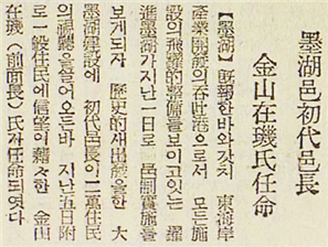 【묵호】 기보旣報한(이미 보도한) 바와 같이 동해안 수산 개발의 탄토항呑吐港(화물의 출입이 많은 큰 항구)으로서 모든 시설의 비약적 정비를 보이고 있는 약진 묵호가 지난 1일로 읍제 실시를 보게 되자 역사적 새 출발을 한 大墨湖(대묵호) 건설에 초대 읍장이 2만 주민의 시청視聽을 끌어오던바 지난 5일부로 일반 주민에 신망이 자자藉藉한 김산재기金山在璣(전 면장) 씨가 임명되었다.