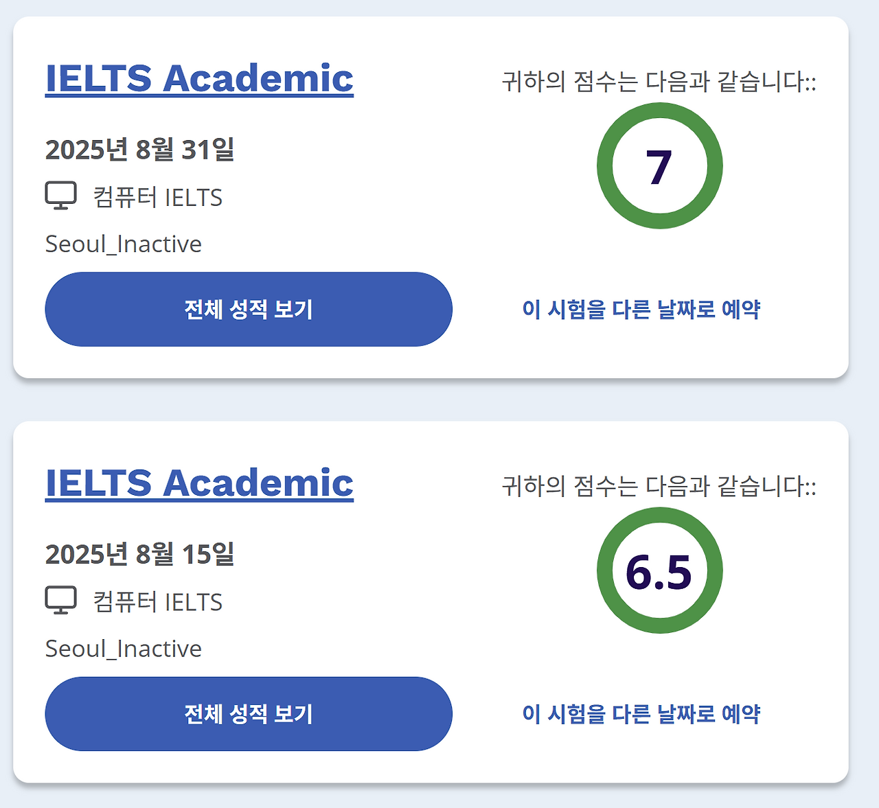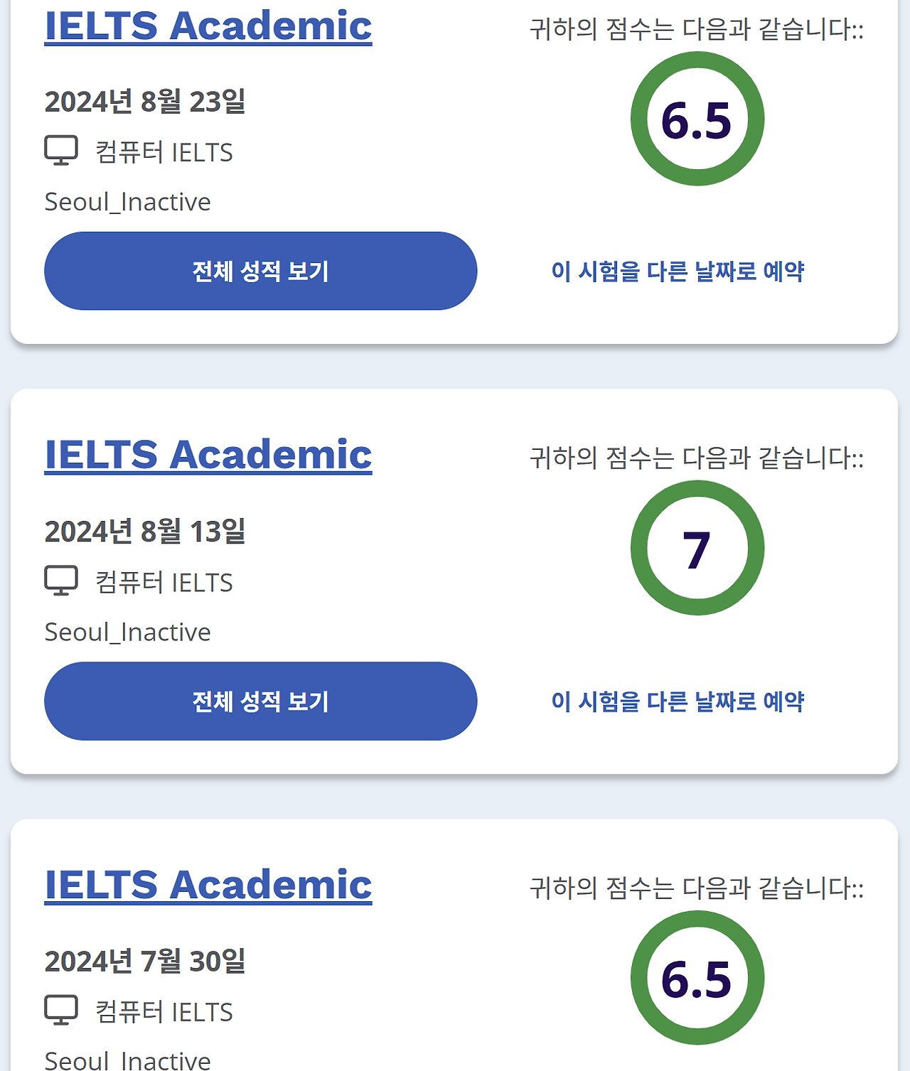 그렇게 부랴부랴 시험을 마무리하고 1라운드 지원을 한 뒤, 재수를 결심했다. 이때 GRE로 전향한 뒤, 또 몇 달을 썼다. 그 이후 7월에 기적적으로 GRE 점수가 나온 뒤, 나는 다시 아이엘츠에 재도전했다.