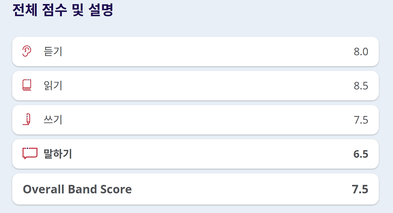 그렇게 처음으로 돌아갔던 나는 약 3주간의 준비 끝에 한번 더 시험을 봤고. Overall 7.5란 성적을 받게 되었다(그 와중에 Each 7.0을 충족 못한 건 정말 레전드 ^^..). 이제 내가 그래도 6.0부터 시작해서 7.5까지 올라왔었을 수 있었던 방법에 대해서 간단히 설명해 보겠다.
